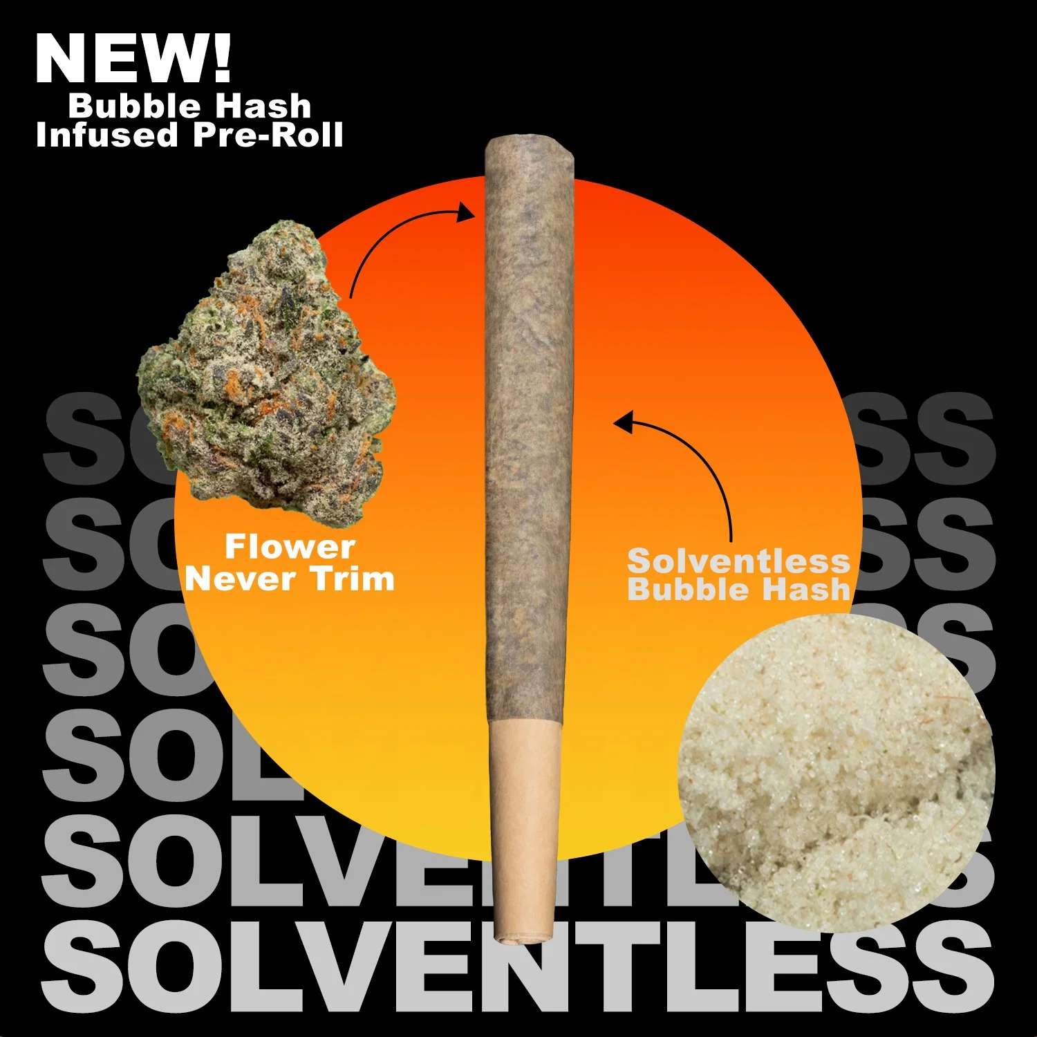 Our Infused Pre-Roll line expands with our solventless products with our all new Bubble Hash Infused Pre-Rolls. 100% solventless with potencies ranging from 35 - 45% reached by solely combining our top tier flower with Ice Water Bubble Hash.